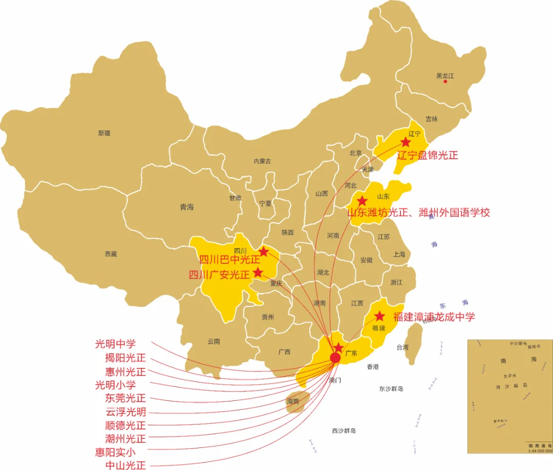 二十多年的发展和沉淀,集团已形成独有的教育品牌,成为优质民办教育的领跑者,被教育业界认定为泛珠三角区域具有影响力的教育集团、中国具有发展潜力和投资价值的教育品牌,并日益成长为中国民办教育的价值典范。 受惠于全面布局粤港澳大湾区,集团立足广东,走向全国。集团在珠三角经济圈,粤港澳大湾区已形成东莞区域光明、光正学校为链头,以广东惠州、潮州、揭阳、佛山、中山等区域为链条,向东北经济圈的辽宁、环渤海经济圈的山东、西南经济圈的四川、海西经济圈的福建等区域拓展辐射的集团办学的优质教育链。目前,集团旗下运营的学校有东莞市光明中学、东莞市光明小学、东莞市光正实验学校、惠州市光正实验学校、盘锦光正实验学校、潍坊光正实验学校、揭阳市光正实验学校、广安光正实验学校学校、漳浦龙成中学(附小)、潍州外国语学校、巴中光正实验学校、云浮市光明外国语学校、顺德光正实验学校、中山市光正实验学校、潮州市光正实验学校、惠州市惠阳区光正实验小学等。现诚邀地方高级人才、名校长、竞赛金牌教练、学科带头人、高层次人才、名校应届毕业生加入光正。